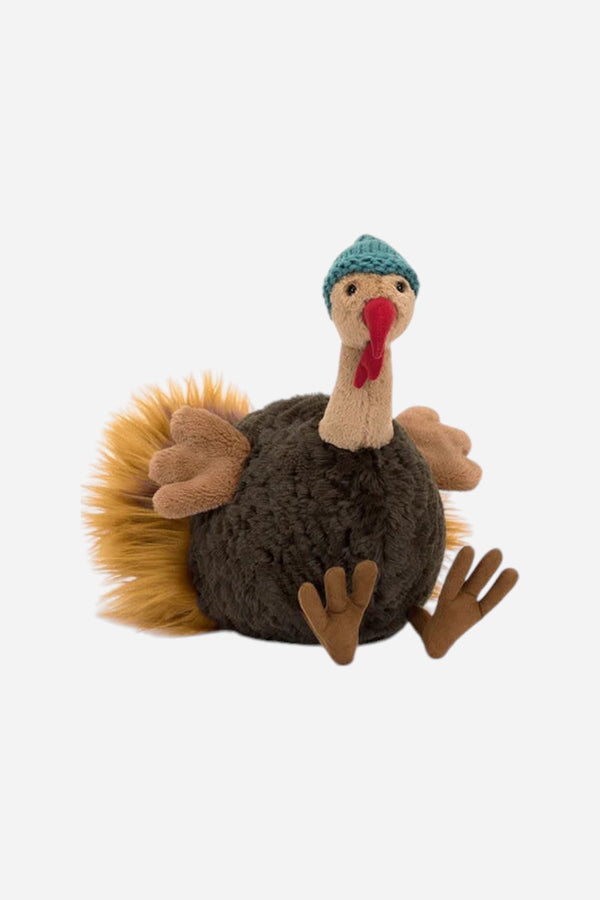 Theo Turkey may have plumage, but this turkey's taking no chances. He's knitted himself a bold teal hat, ready for the winter! Theo has over-sized honey feet, a round cocoa tummy and a silky ginger tail. Most impressive of all, this proud turkey has a beautiful suedette caruncle (that's the wobbly bit under his beak). A dazzling gift for happy holidays.