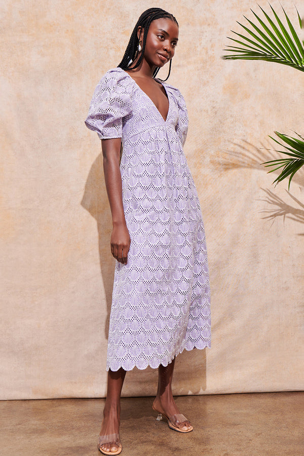 Seas the day with the shell eyelet midi. Our Wilhelmina dress is cut from a beautiful eyelet fabric with a seashell motif. Featuring hidden pockets at side, voluminous balloon sleeves, a tie back, and scalloped hem. The v-neckline gives the dress a flattering shape to the otherwise simple fit. Pair the lavender number with simple heels to complete the look.