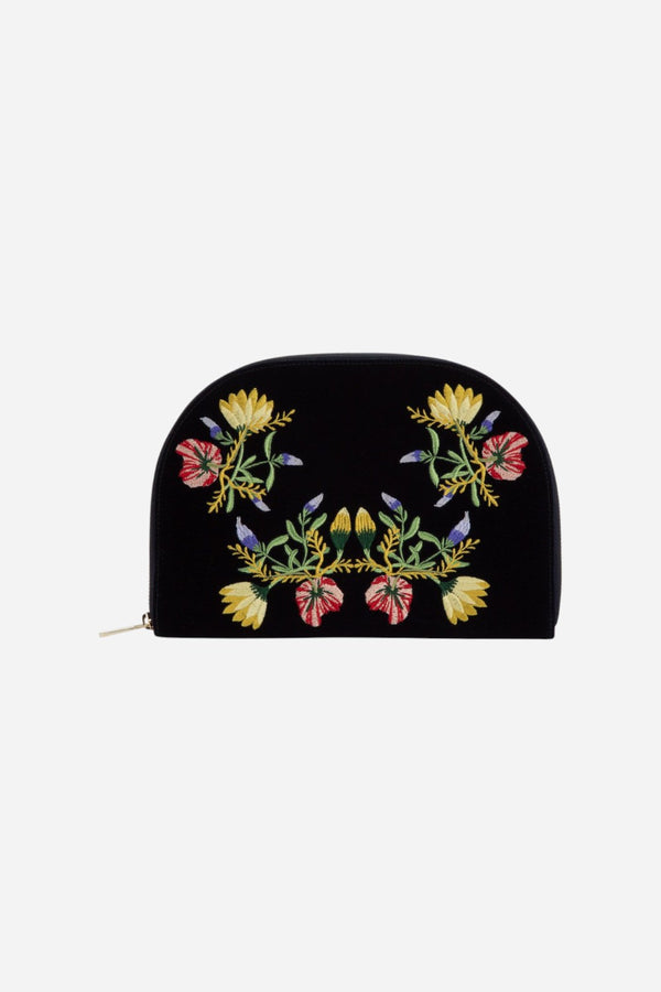 Plush indigo velvet and beautiful pale gold hardware make up this charming travel portfolio. Stores your best pieces while on-the-go with 2 earring holders, 2 ring rolls, 1 medium zip pocket, 1 large zip pocket large, 4 necklace holders, LusterLoc™ lining, and a removable round mirror.