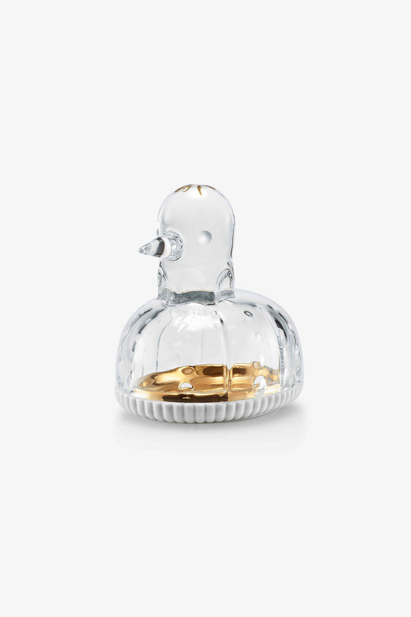 Created by Jaime Hayon, the Zoo jewelry box in crystal and porcelain is the ideal design accessory for storing your finest adornments and small precious objects. Composed of a crystal cover in the shape of a duck and a porcelain base by Lladró , the jewelry box revisited by Jaime Hayon displays a unique and quirky style. With its pointed beak and its delicately cut rounded silhouette, the duck brings a little fantasy to your interior. As a small glamorous detail, a few touches of gold applied by hand on the animal's head provide the final signature.